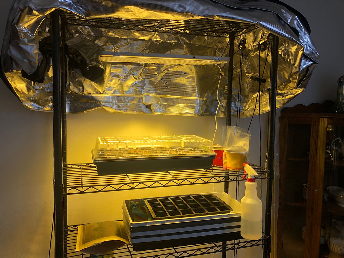 I got the metal grow stand from my grandpa and it’s amazing. It has wheels so it’s really easy to move around and the pully system lets me adjust the height of each rack, meaning that as seedlings grow, I just adjust the rack instead of messing with the light. The cover isn’t needed per se, but I find that it helps reflect the light back onto the seed trays so less light escapes. And of course, the handy dandy spray bottle helps with gently misting seedlings.